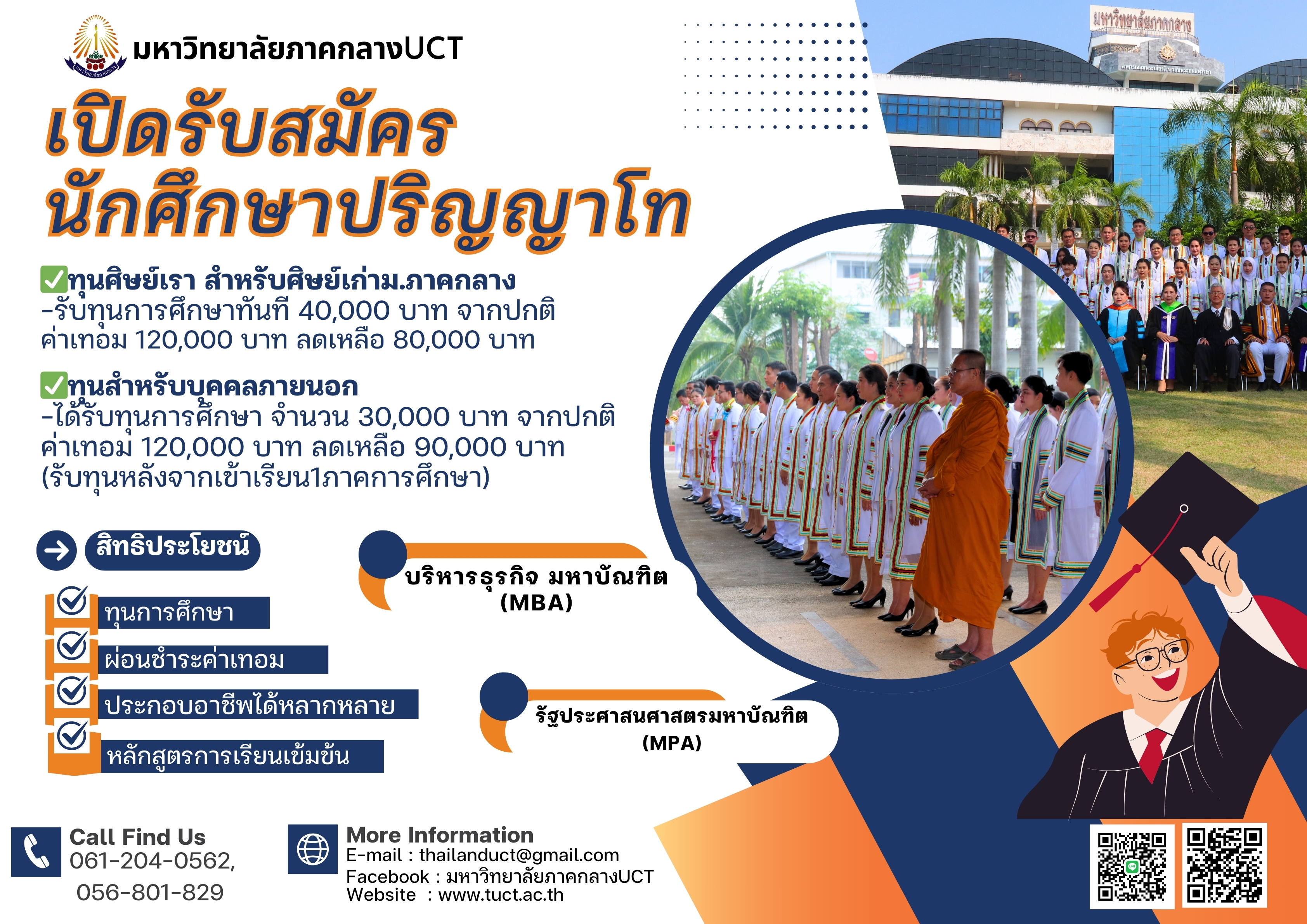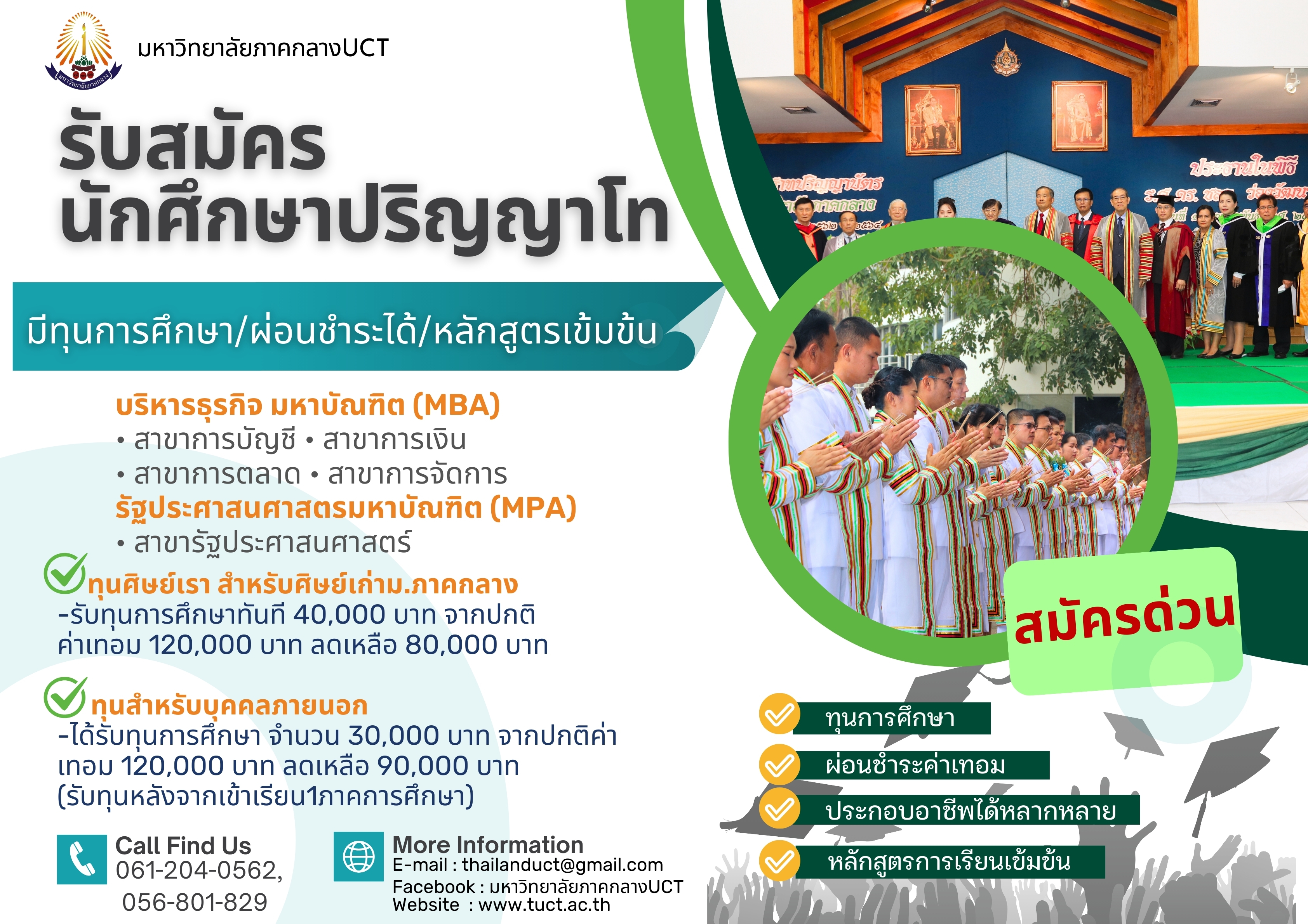 ส่งชื่อ-สกุล วันเดือนปีเกิด ที่อยู่ เบอร์โทรศัพท์ เลขบัตรประชาชน 13 หลัก วุฒิที่จบ และหลักสูตรที่ต้องการสมัครที่ line มหาวิทยาลัยภาคกลาง ID: uctthailand (@sky) เบอร์ 0612040562