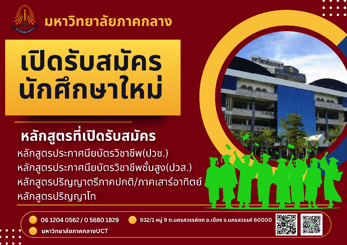 ส่งชื่อ-สกุล วันเดือนปีเกิด ที่อยู่ เบอร์โทรศัพท์ เลขบัตรประชาชน 13 หลัก วุฒิที่จบ และหลักสูตรที่ต้องการสมัครที่ line มหาวิทยาลัยภาคกลาง ID: uctthailand (@sky) เบอร์ 0612040562